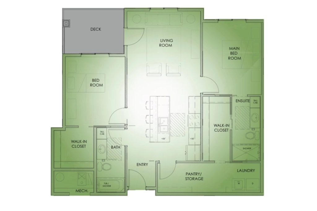 This two-bedroom, two-bathroom floor plan builds on the same smart design with a bit of extra space for added comfort and flexibility. The kitchen opens seamlessly into the living area and features a generous island with pendant lighting, creating an easy, open feel ideal for both everyday living and entertaining. Both bedrooms offer walk-in closets, while the primary suite is thoughtfully arranged with a private ensuite bathroom, walk-in closet, and convenient access to the laundry. A private deck with wooded views extends the living space outdoors, offering a quiet place to relax and unwind. Enjoy true maintenance-free condo living.
